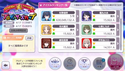 末吉です。 シャニマスにて、4周年を記念して「4th Anniversery プロデューサーズカップ」というランキングイベントが開催されました。 私もイベントをひた走り、杜野凛世で5位という成績を納めることができました。 よかったですね。